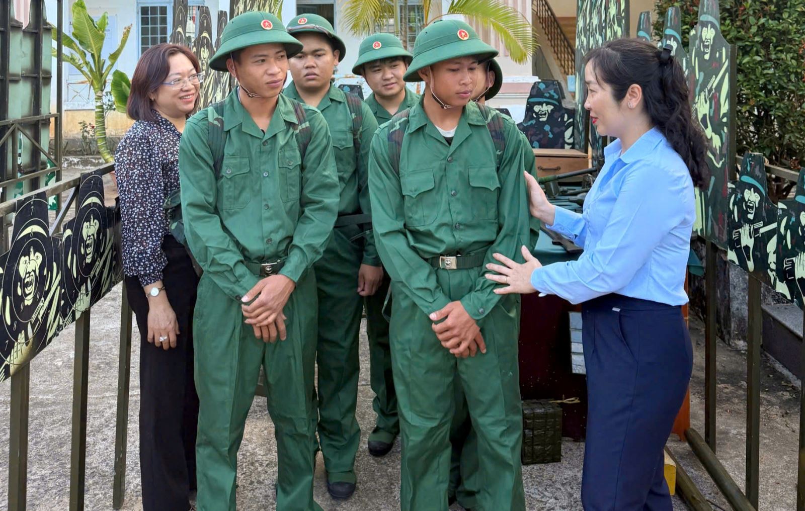 Phó Chủ tịch Ủy ban MTTQ Việt Nam tỉnh, Chủ tịch Hội LHPN tỉnh Quảng Ngãi Nguyễn Thị Lan (bìa phải) thăm, động viên các tân binh xã Ia Chim